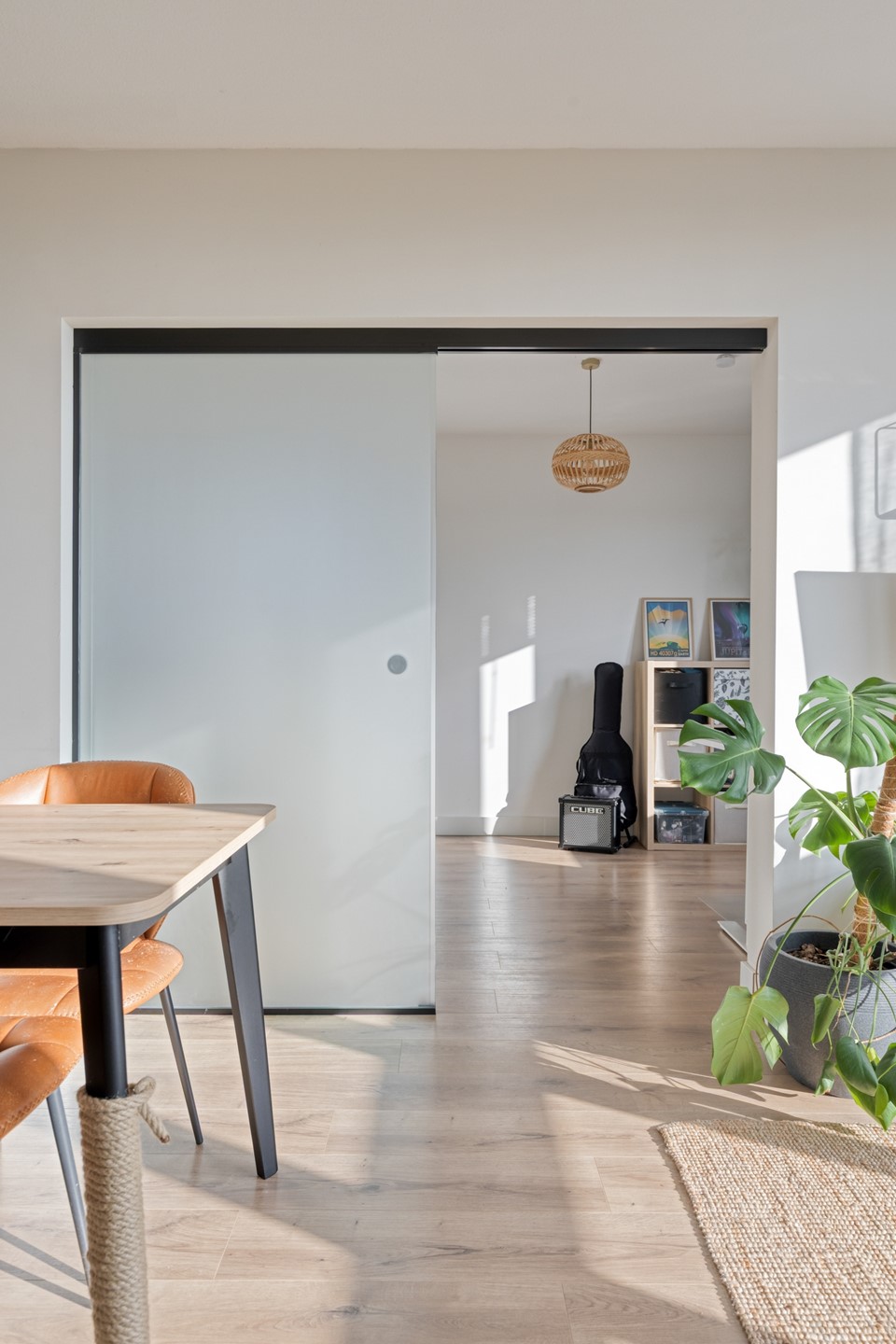 De stijlvolle badkamer is voorzien van een inloopdouche en een wastafelmeubel. Door het hele appartement ligt een prachtige vloer die zorgt voor een warme en verzorgde uitstraling.