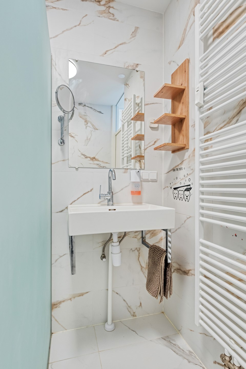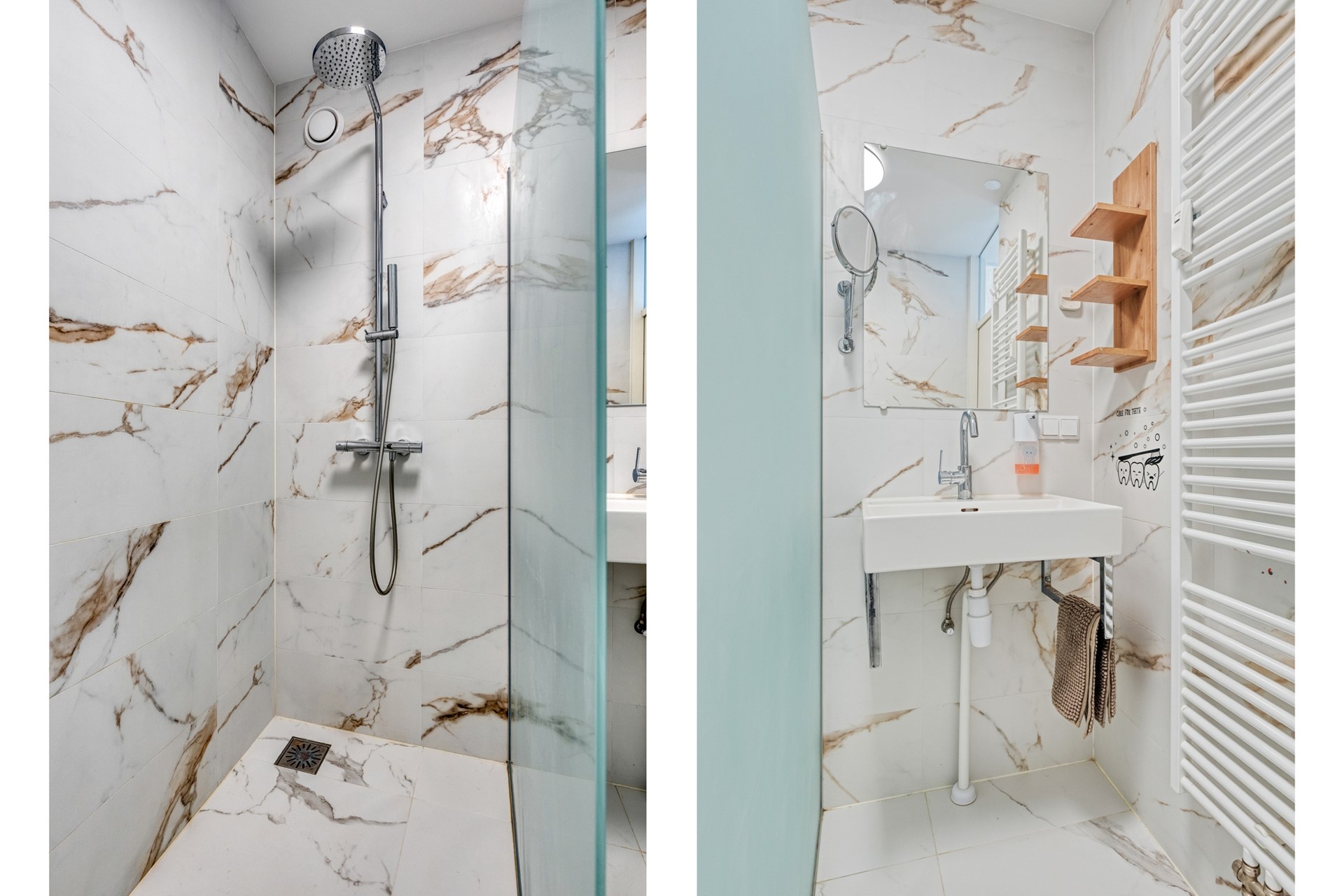 Situated on the 7th floor, you enter the apartment through the hallway equipped with a video intercom and access to all rooms. Here you’ll find a practical laundry room and a modern separate toilet with a small wash basin.