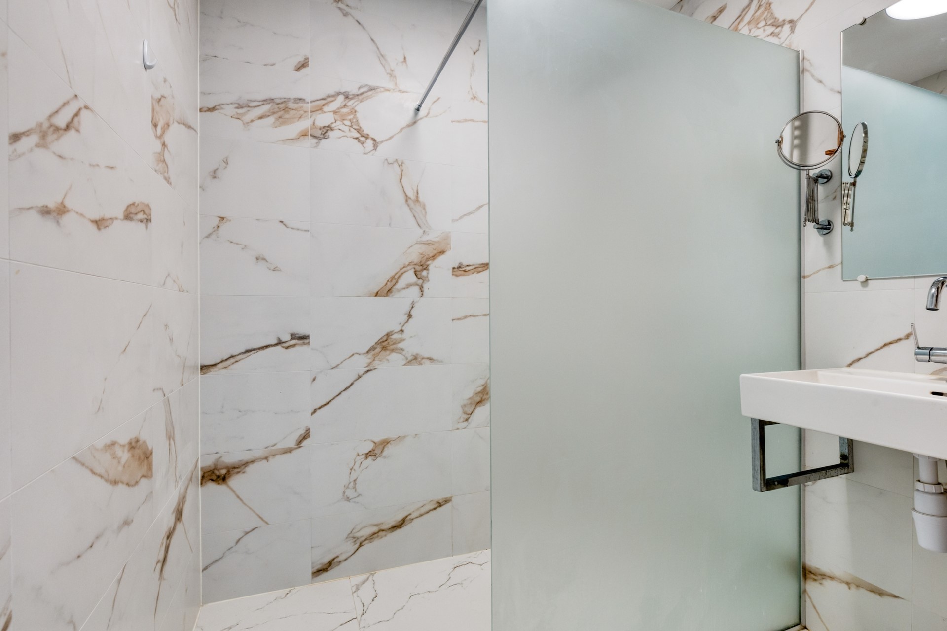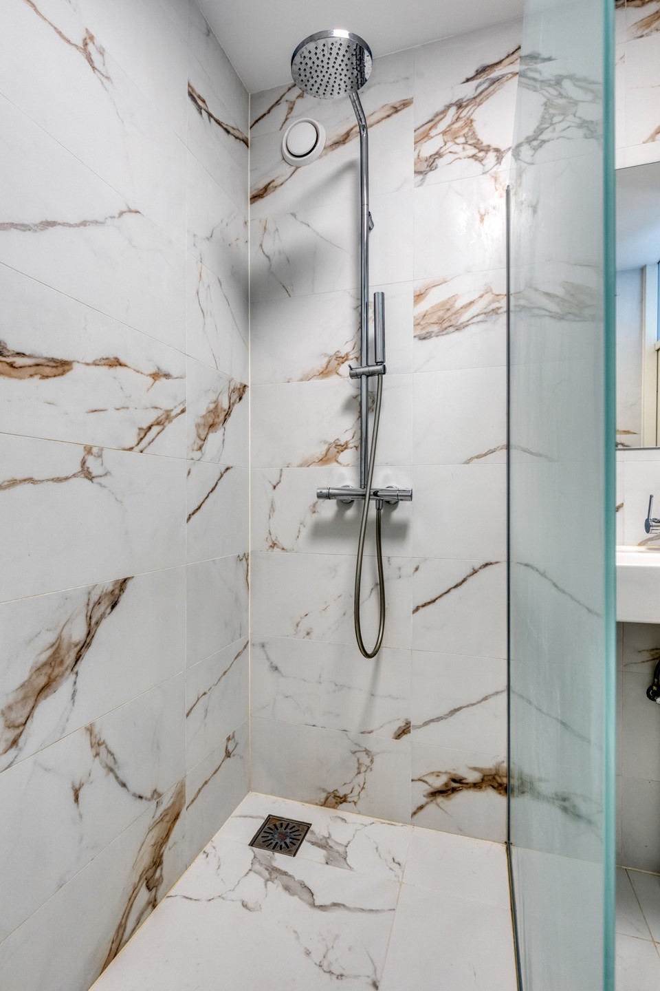 The stylish bathroom features a walk-in shower and a washbasin with a vanity unit. Throughout the apartment lies a beautiful floor, giving the home a warm and well-finished appearance.